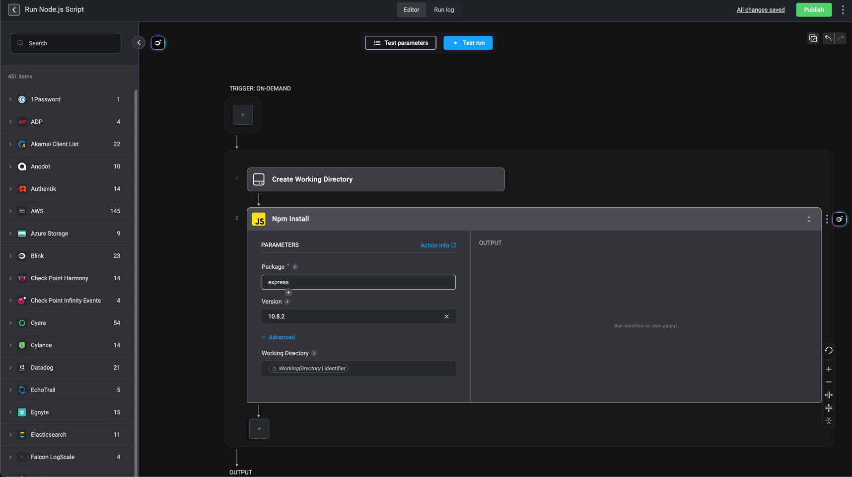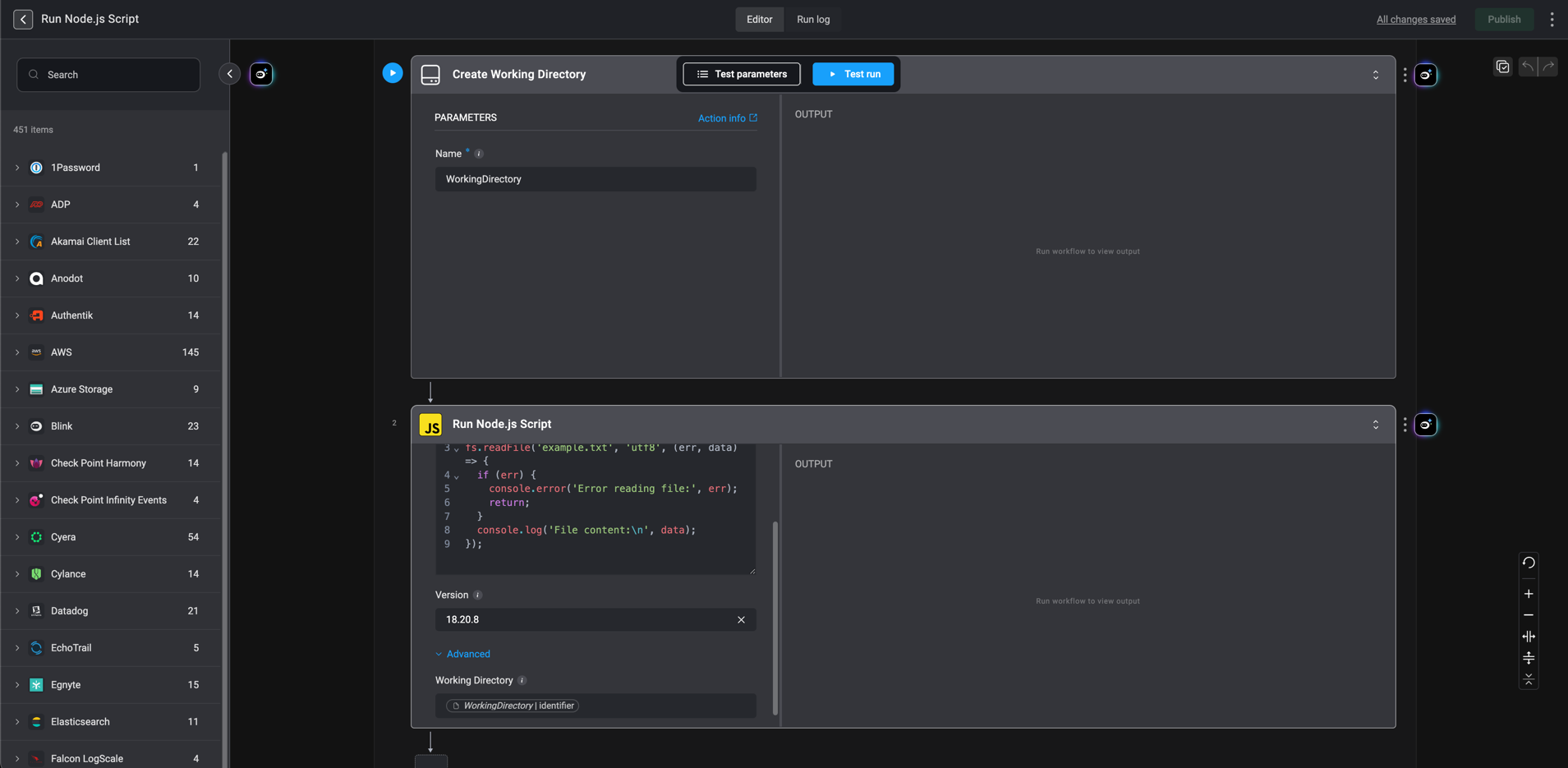 Working Directoryparameter of the ‘Run Node.js Script’ action, enter the name of theWorking Directoryyou created in step one.