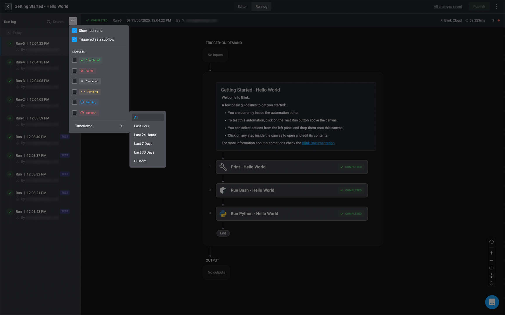 | 8 | Runner | Identifies the runner(e.g., Blink Cloud) used to execute the workflow. |