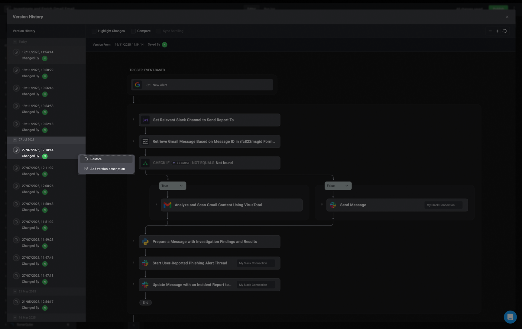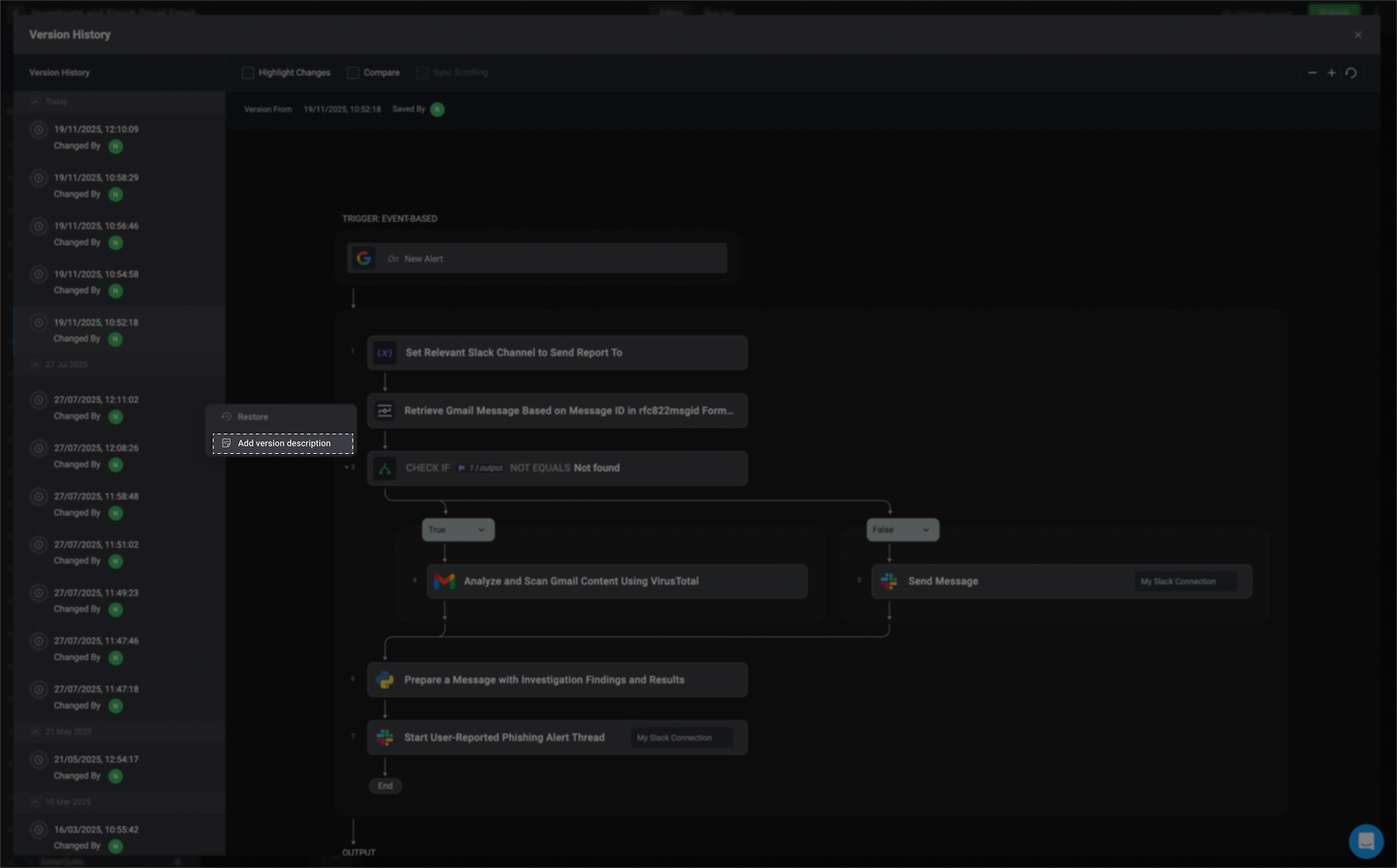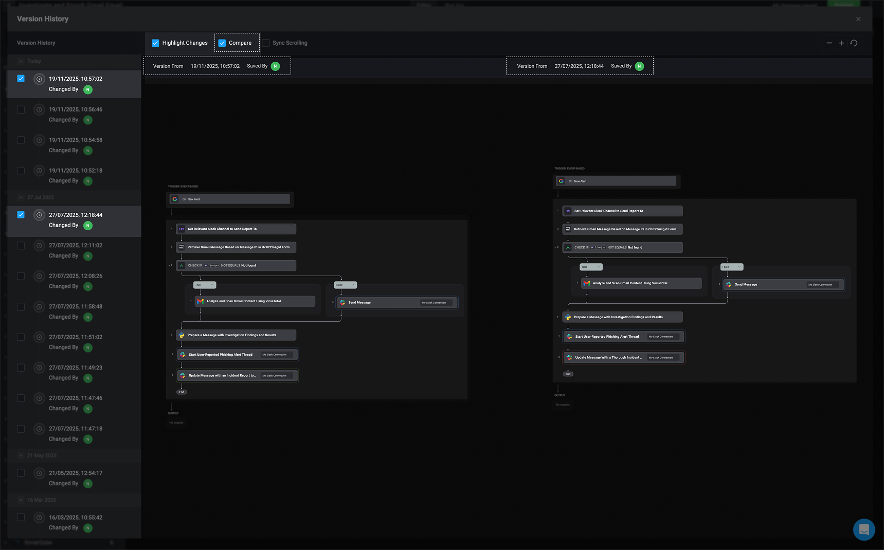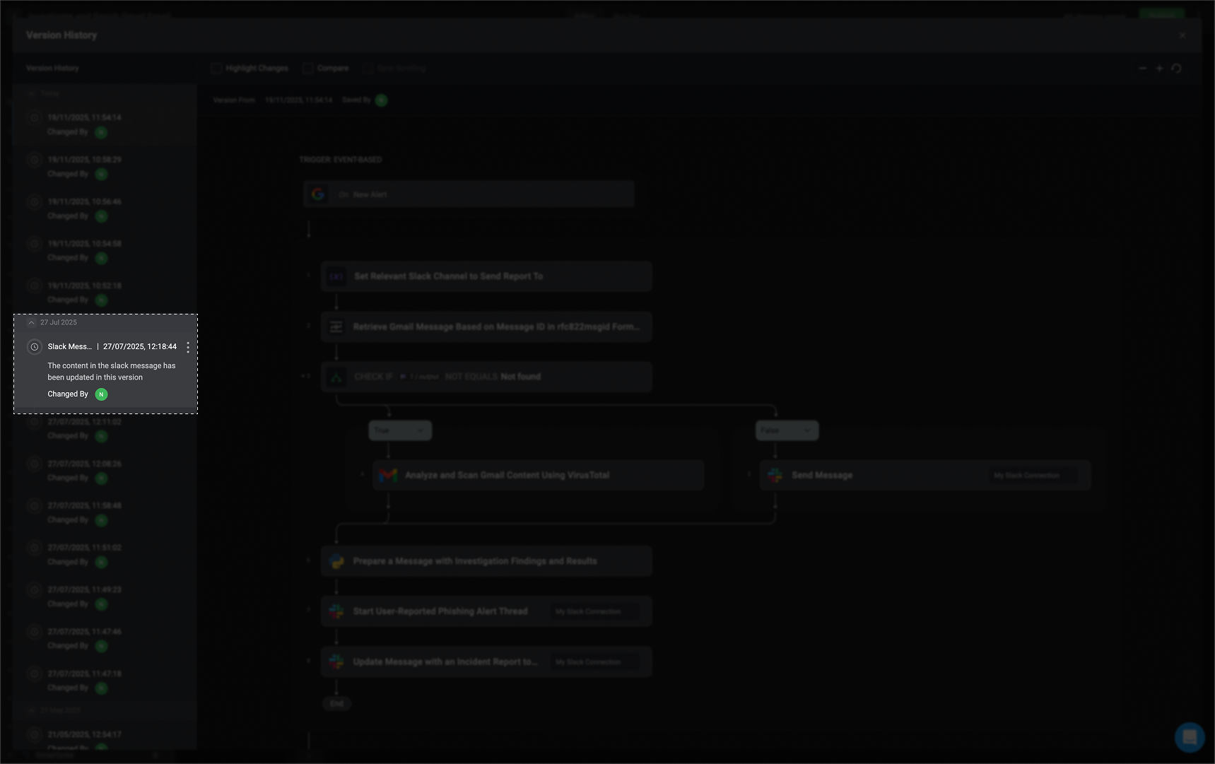 The left-hand sidebar displays a timeline of all workflow versions, including when each change was made and who made it. This provides clear visibility into the workflow’s evolution and helps you track contributions over time.