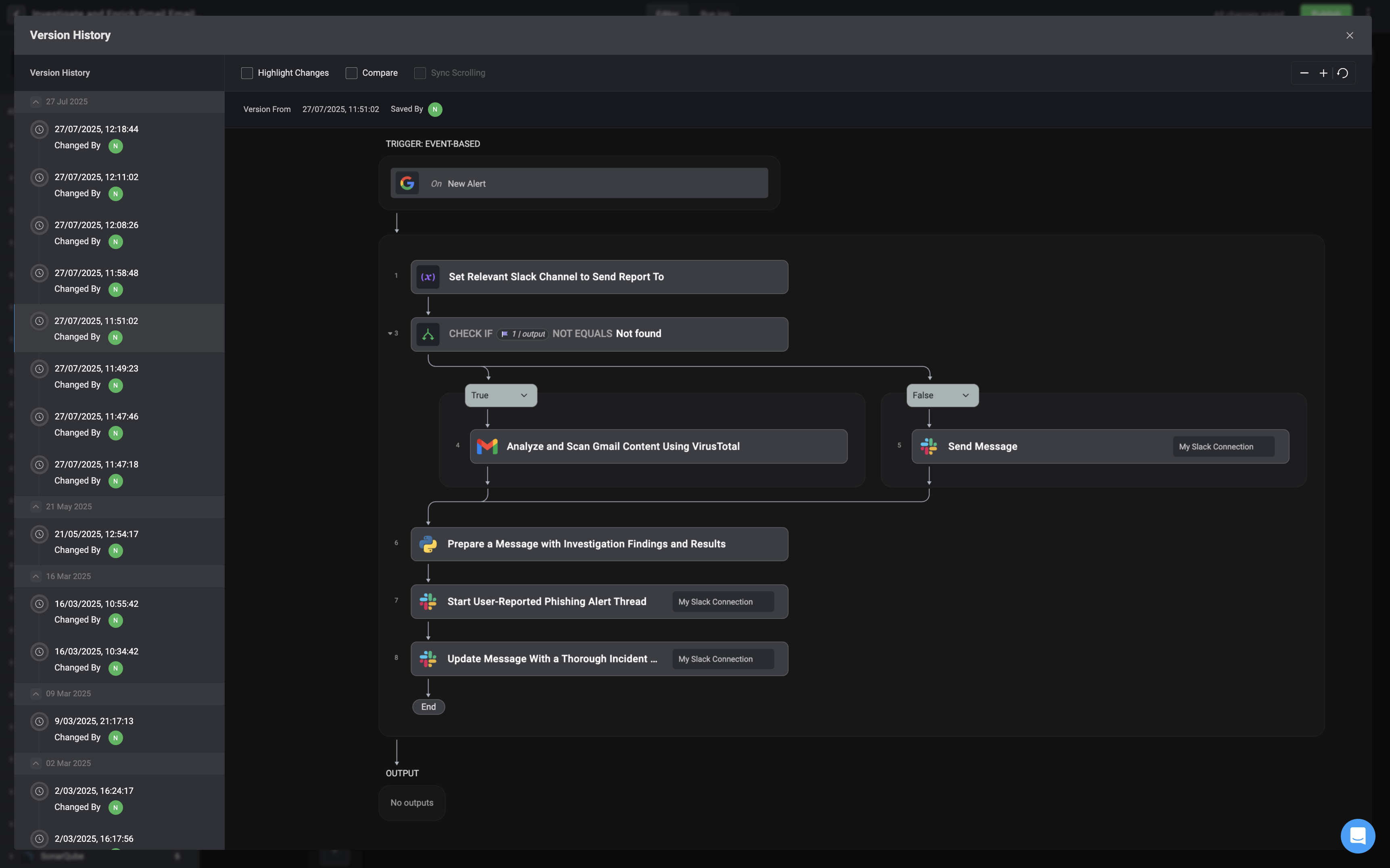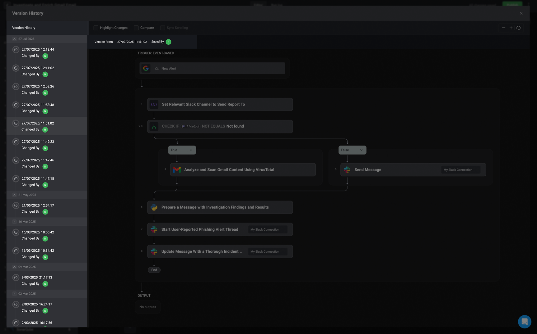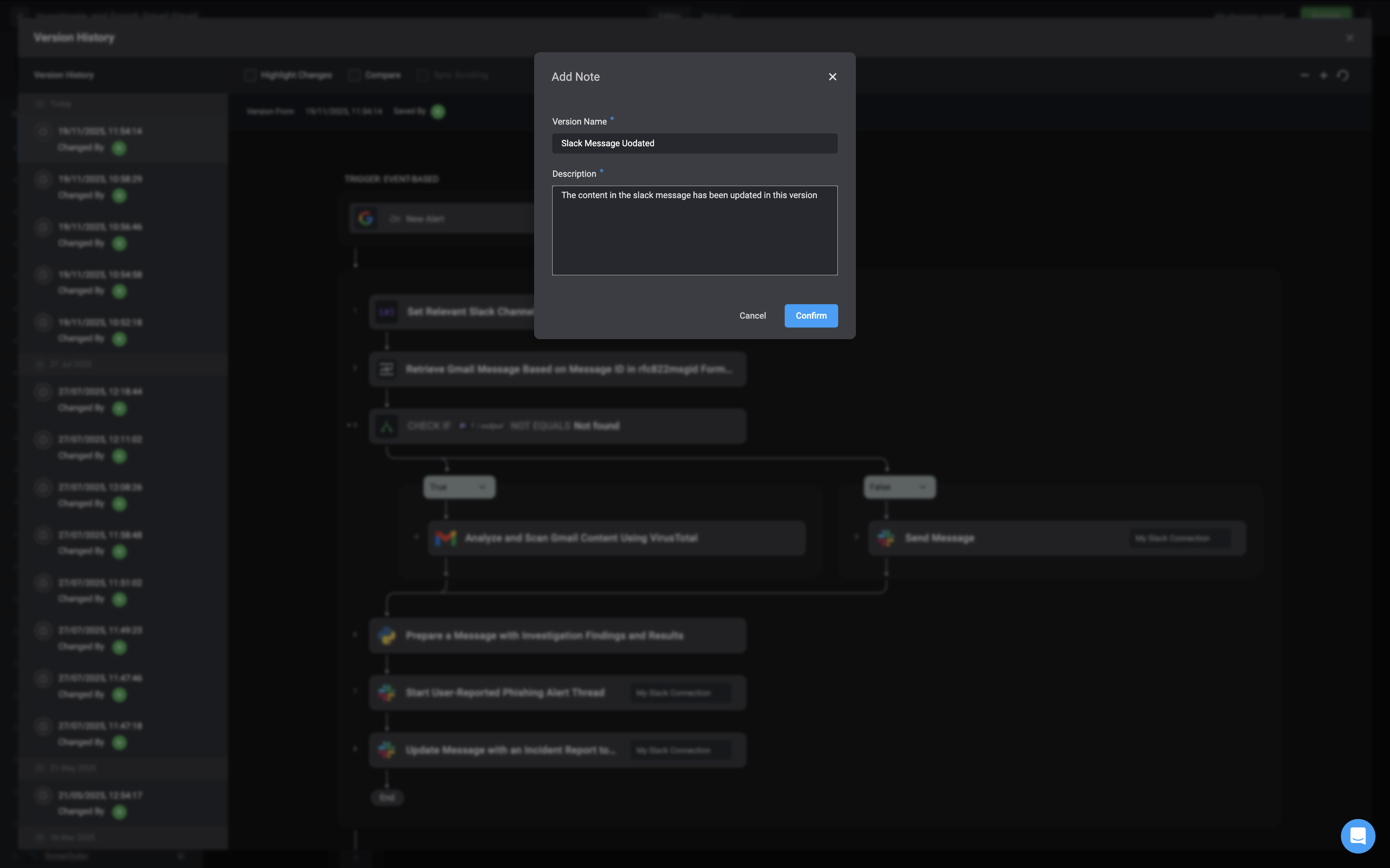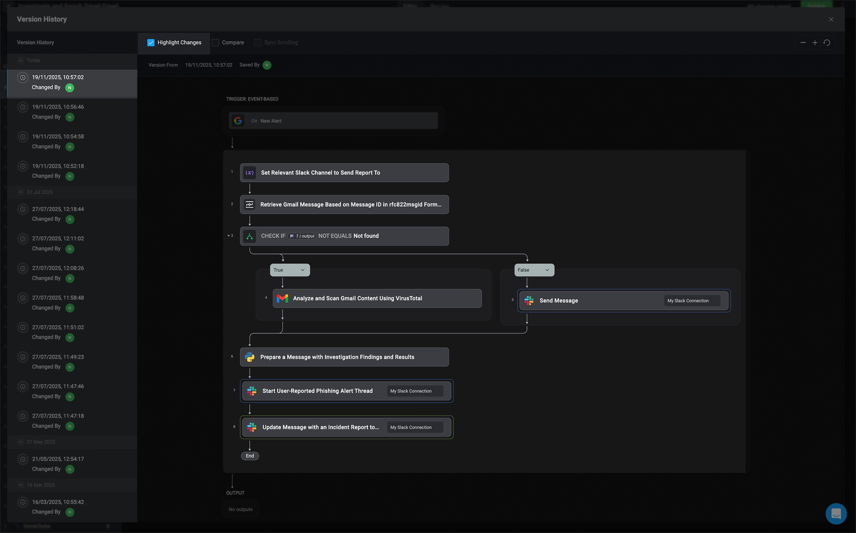 The left-hand sidebar displays a timeline of all workflow versions, including when each change was made and who made it. This provides clear visibility into the workflow’s evolution and helps you track contributions over time.