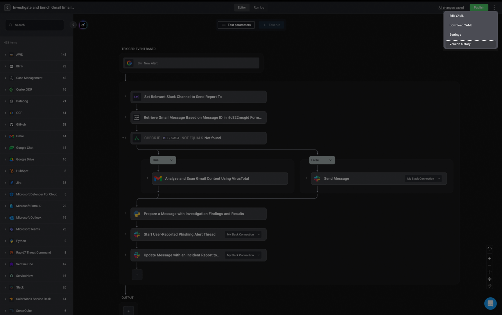 To access the Version History feature, click the menu icon in the top-right corner of the workflow editor and select the Version History option.